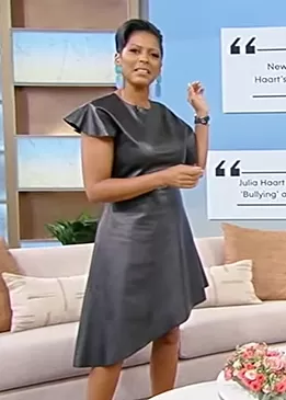 Tamron Hall on Tamron Hall Show on ABC was spotted wearing this black leather asymmetric dress on Tamron Hall Show on Dec 02 2022's episode. Tamron's Dress is the Asymmetric leather mini dress by Loewe.