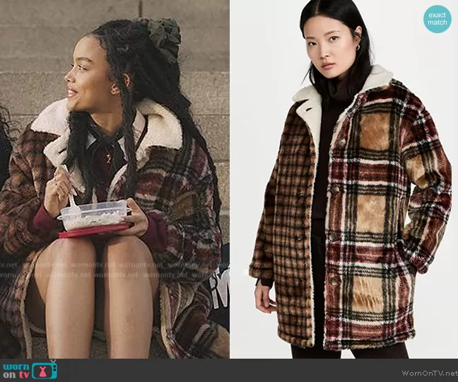Zoya Lott (played by Whitney Peak) on Gossip Girl on HBO Max was spotted wearing this mixed plaid sherpa jacket on Gossip Girl on episode 'Deb Brawl in a Blue Dress' (2x01) in Dec 2022. Zoya's Jacket is the Faux Fur Plaid Coat by Something Navy.