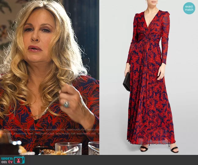 Tanya McQuoid (played by Jennifer Coolidge) on The White Lotus on HBO was spotted wearing this blue and red feather print dress on The White Lotus on episode 'Abductions' (2x06) in Dec 2022. Tanya's Dress is the Adara Dress by Diane von Furstenberg.