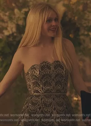 Audrey Hope (played by Emily Alyn Lind) on Gossip Girl on HBO Max was spotted wearing this Audrey metallic scalloped mini dress on Gossip Girl on episode 'Deb Brawl in a Blue Dress' (2x01) in Dec 2022. Audrey's Dress is the Strapless embellished tulle mini dress by Oscar de la Renta.