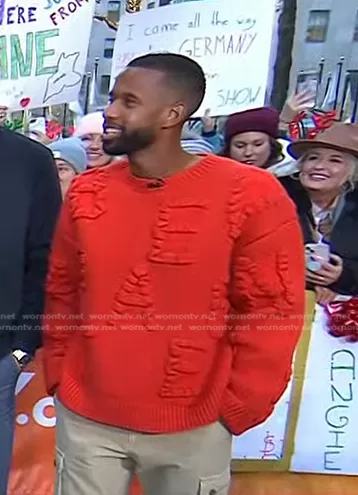 on Today on NBC was spotted wearing this red knit sweater on Today on Dec 05 2022's episode. 's Sweater is the Logo-Intarsia Wool-Blend Sweater by Bottega Veneta.
