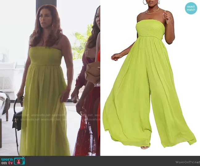 Robyn Dixon on The Real Housewives of Potomac on Bravo was spotted wearing this green smocked wide leg jumpsuit on The Real Housewives of Potomac on episode 'Ambush in Paradise' (7x09) in Dec 2022. Robyn's Jumpsuit is the Off Shoulder Smocked Wide Leg Jumpsuit by Ophestin.