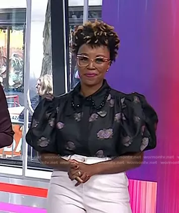 on Today on NBC was spotted wearing this black floral puff sleeve top on Today on Dec 05 2022's episode. 's Top is the Dream Maria Flora Shirt by Sister Jane.