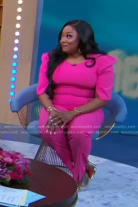on Good Morning America on ABC was spotted wearing this pink puff sleeve jumpsuit on Good Morning America on Dec 05 2022's episode. 's Jumpsuit is the Russo Puff-Sleeve Jumpsuit by Black Halo.