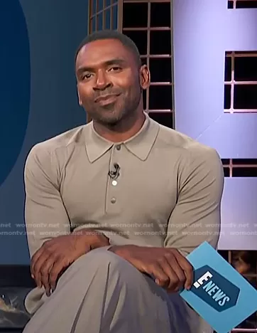 Justin Sylvester on E! News on E! was spotted wearing this beige long sleeve polo shirt on E! News on Nov 30 2022's episode. Justin's Shirt is the Long Sleeve Wool Polo in Tapir by Theory.
