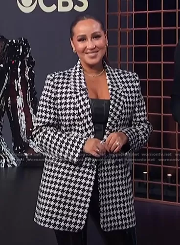 Adrienne Houghton on E! News on E! was spotted wearing this houndstooth blazer on E! News on Dec 05 2022's episode. Adrienne's Jacket is the Madeleine Blazer by Anine Bing . Adrienne's Pants is the Maddox Patent Leggings by Alice + Olivia.