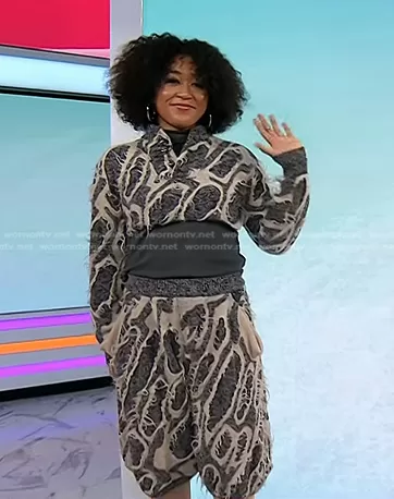 on Today on NBC was spotted wearing this grey mohair sweater and shorts on Today on Dec 06 2022's episode. 's Sweater is the Fray Knit Cropped Pullover by Louis Vuitton . 's Pants is the Fray Knit Bloomers by Louis Vuitton.