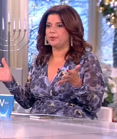 Ana Navarro on The View on ABC was spotted wearing this blue floral print wrap dress on The View on Dec 06 2022's episode. Ana's Dress is the Floral mesh wrap midi dress by Ganni.