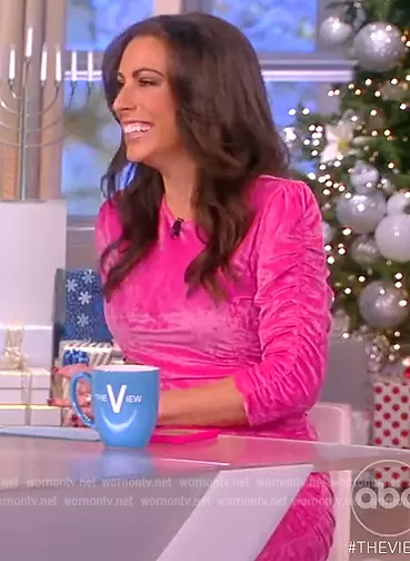 Alyssa Farah Griffin on The View on ABC was spotted wearing this pink velvet ruched dress on The View on Dec 06 2022's episode. Alyssa's Dress is the Ruched Crushed Velvet Dress by Ganni.
