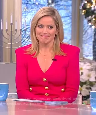 Sara Haines on The View on ABC was spotted wearing this pink cardigan on The View on Dec 06 2022's episode. Sara's Sweater is the Ribbed padded shoulder cardigan by Balmain.