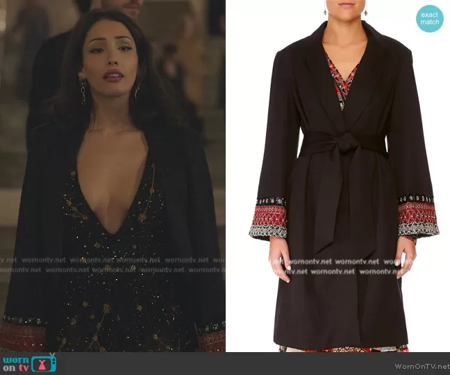 Luna La (played by Zión Moreno) on Gossip Girl on HBO Max was spotted wearing this black embroidered coat on Gossip Girl on episode 'Deb Brawl in a Blue Dress' (2x01) in Dec 2022. Luna's Robe is the Flared Sleeve Trench by Camilla.
