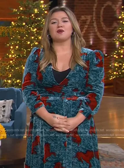 Kelly Clarkson on The Kelly Clarkson Show on NBC was spotted wearing this blue horse print wrap dress on The Kelly Clarkson Show on Dec 07 2022's episode. Kelly's Dress is the Lainey Dress by Rhode.