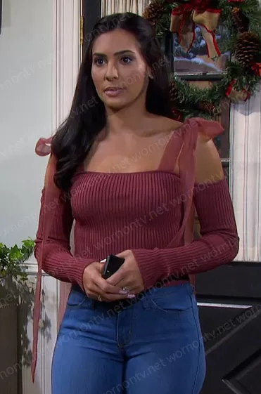 Gabi Hernandez (played by Camila Banus) on Days of our Lives on Peacock was spotted wearing this pink ribbed sheer strap top on Days of our Lives on Dec 08 2022's episode. Gabi (old)'s Top is the Combination Strap Knit Top by Zara.