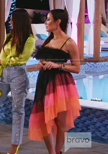 Angie Katsanevas on The Real Housewives of Salt Lake City on Bravo was spotted wearing this black cropped top and asymmetric tulle skirt on The Real Housewives of Salt Lake City on episode 'High Heels to High Seas' (3x10) in Dec 2022. Angie K's Top is the Strapless Tulle Top by Paskal . Angie K's Skirt is the Asymmetric Tulle Skirt with Ruffles by Paskal.