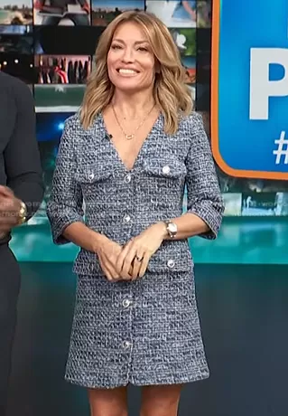 Kit Hoover on Access Hollywood on NBC was spotted wearing this blue tweed dress on Access Hollywood on Dec 08 2022's episode. Kit's Dress is the Rollye Tweed Mini Dress by Maje.
