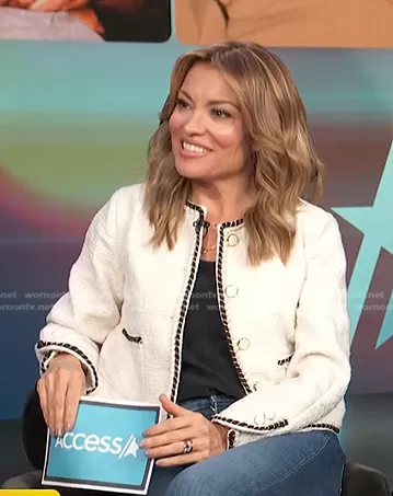 Kit Hoover on Access Hollywood on NBC was spotted wearing this white braid-trim tweed jacket on Access Hollywood on Dec 08 2022's episode. Kit's Jacket is the Braided Trim Tweed Jacket by Aqua.