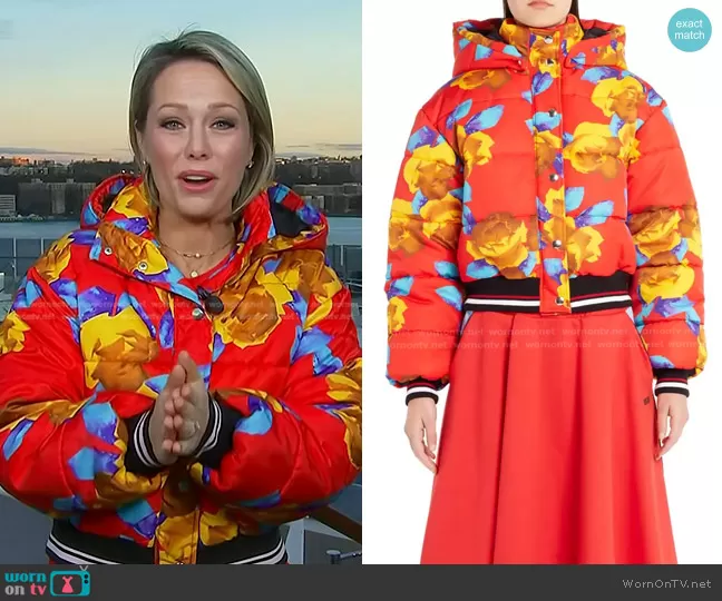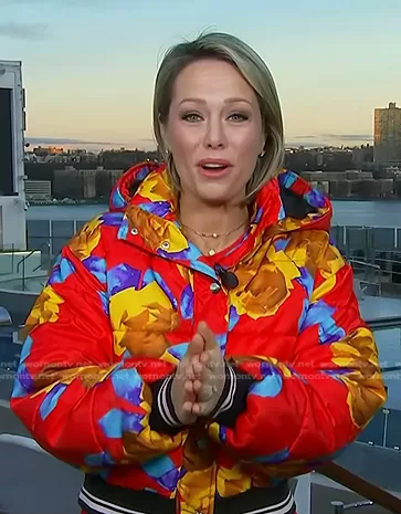 Dylan Dreyer on Today on NBC was spotted wearing this red floral puffer jacket on Today on Dec 08 2022's episode. Dylan's Jacket is the Floral Print Crop Puffer Jacket by MSGM.
