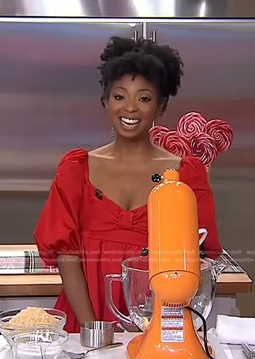on Today on NBC was spotted wearing this red puff sleeve dress on Today on Dec 08 2022's episode. 's Dress is the Beau Satin Puff Sleeve Dress by Kate Spade.