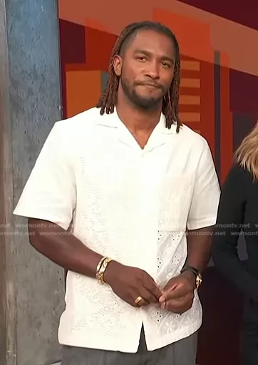 Scott Evans on Access Hollywood on NBC was spotted wearing this white crochet short sleeve shirt on Access Hollywood on Jan 02 2023's episode. Scott's Shirt is the Crochet Patchwork Shirt in Ecru by Zara.
