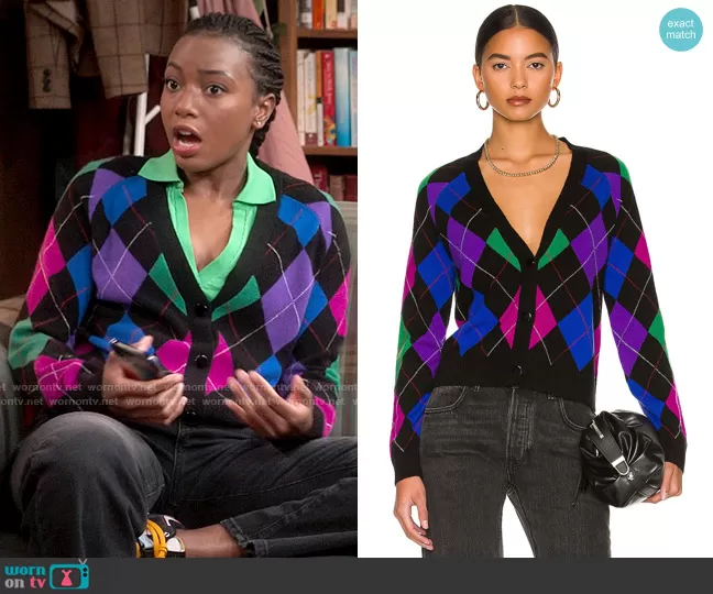 Whitney Chase (played by Alyah Chanelle Scott) on The Sex Lives of College Girls on HBO was spotted wearing this colorful argyle cardigan on The Sex Lives of College Girls on episode 'The Essex College Food Workers Strike' (2x07) in Dec 2022. Whitney's Sweater is the Argyle Gem Cardigan by Le Superbe.