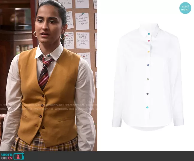 Bela Malhotra (played by Amrit Kaur) on The Sex Lives of College Girls on HBO was spotted wearing this yellow waistcoat and white button down shirt on The Sex Lives of College Girls on episode 'The Essex College Food Workers Strike' (2x07) in Dec 2022. Bela's Top is the Long Sleeve Multi Button Shirt by PS Paul Smith . Bela's Vest is the Classic Waistcoat with Pockets in Curry by Zara.