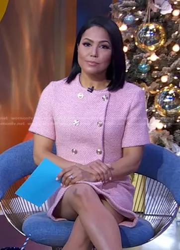 Stephanie Ramos on Good Morning America on ABC was spotted wearing this pink double breasted tweed dress on Good Morning America on Dec 08 2022's episode. Stephanie's Dress is the Rirosila Tweed Mini Dress by Maje.