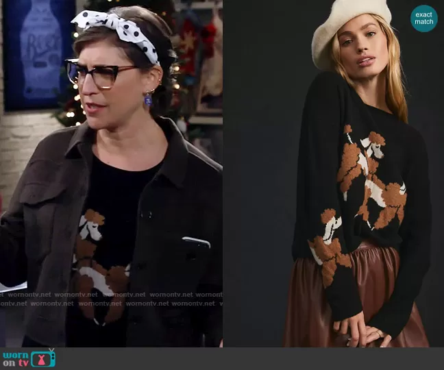 Kat Silver (played by Mayim Bialik) on Call Me Kat on Fox was spotted wearing this poodle sweater on Call Me Kat on episode 'Call Me Chrismukkah' (3x09) in Dec 2022. Kat's Sweater is the Cashmere Intarsia Sweater in Black by Maeve at Anthropologie . Kat's Jacket is the Easton Jacket by Rails.