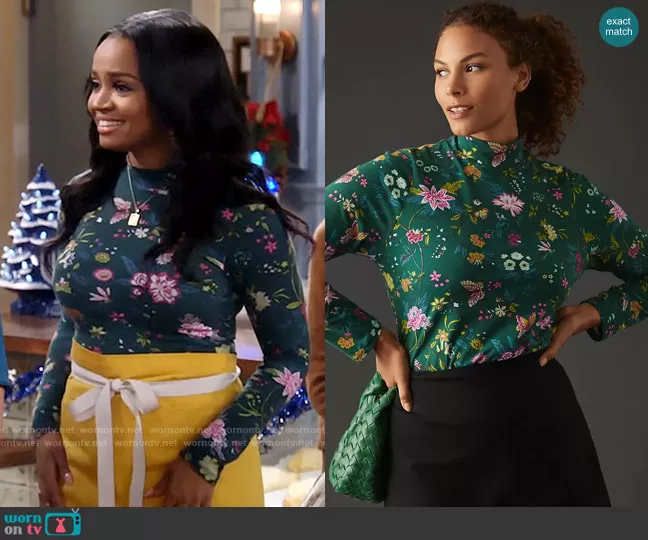 Randi (played by Kyla Pratt) on Call Me Kat on Fox was spotted wearing this green floral long sleeved top on Call Me Kat on episode 'Call Me Chrismukkah' (3x09) in Dec 2022. Randi's Top is the Printed Turtleneck Top in Green by Maeve at Anthropologie.
