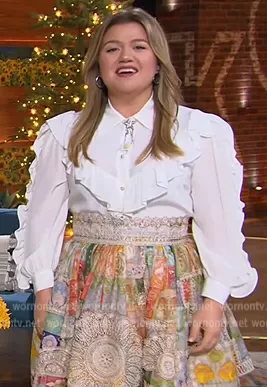 Kelly Clarkson on The Kelly Clarkson Show on NBC was spotted wearing this patchwork mini skirt on The Kelly Clarkson Show on Dec 09 2022's episode. Kelly's Skirt is the Cosmic Zodiac Doiley linen-blend mini skirt by Zimmermann.
