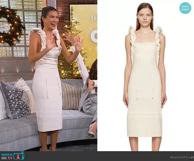 on The Kelly Clarkson Show on NBC was spotted wearing this off white ruffle midi dress on The Kelly Clarkson Show on Dec 09 2022's episode. 's Dress is the Crema textured cotton-blend midi dress by Jacquemus.