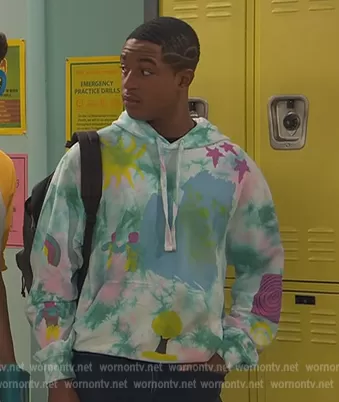 Booker Baxter (played by Issac Ryan Brown) on Ravens Home on Disney was spotted wearing this blue tie dye hoodie on Ravens Home on episode 'Keeping It 100' (5x19) in Oct 2022. Booker's Sweater is the Blue Tie-Dye Earth Up Hoodie by McQ.