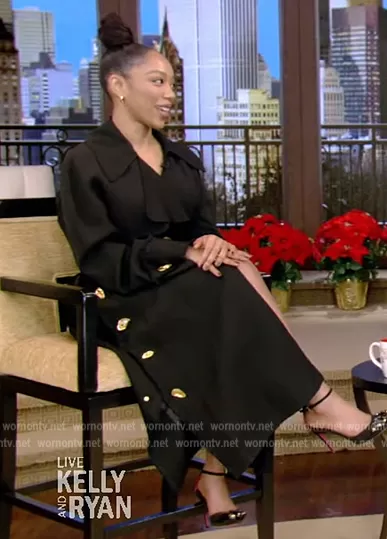 on Live with Kelly and Mark on Disney ABC Home Entertainment was spotted wearing this black gold button coat on Live with Kelly and Ryan on Dec 12 2022's episode. 's Coat is the Trench Coat by Schiaparelli . 's Belt is the Face Buckle Belt by Schiaparelli.