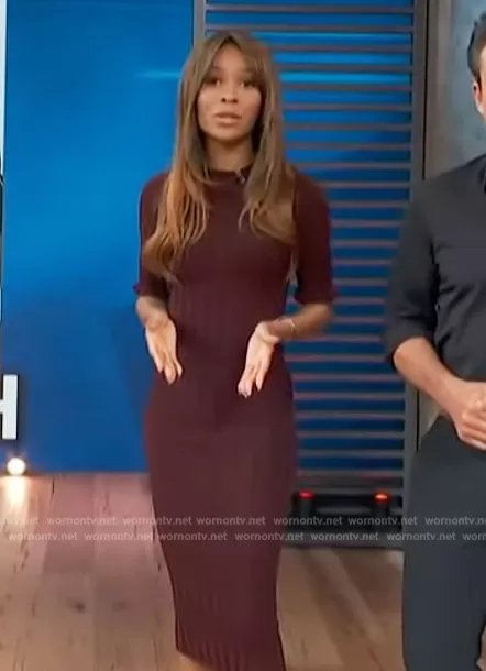 Zuri Hall on Access Hollywood on NBC was spotted wearing this burgundy ribbed dress on Access Hollywood on Nov 11 2023's episode. Zuri's Dress is the Pointelle-trimmed ribbed-knit midi dress by Joie.