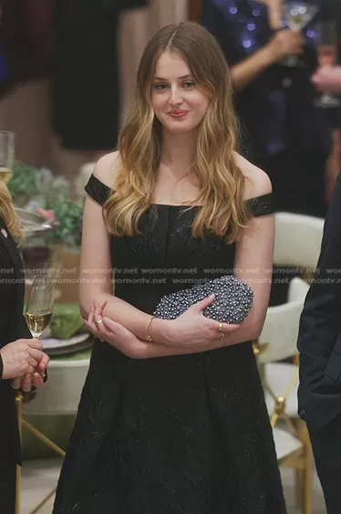 Grace Byron (played by Anna Van Patten) on Gossip Girl on HBO Max was spotted wearing this Grace’s black off shoulder gown on Gossip Girl on episode 'Great Reputations' (2x03) in Dec 2022. 's Dress is the Carina Metallic Floral Brocade Cocktail Dress by Kay Unger.