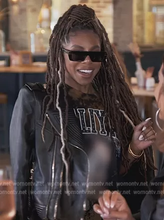 Candiace Dillard Bassett on The Real Housewives of Potomac on Bravo was spotted wearing this black moto jacket and printed tee on The Real Housewives of Potomac on episode 'Cleaning Up the Mess' (7x10) in Dec 2022. Candiace's Top is the Aaliyah Black Bleach Tunic by Fashion Nova . Candiace's Jacket is the Black Lambskin Biker Jacket by Balmain . Candiace's Bag is the Mini Jodie Bag by Bottega Veneta.