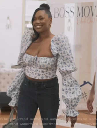 Ciera on The Real Housewives of Potomac on Bravo was spotted wearing this white floral puff sleeve blouse on The Real Housewives of Potomac on episode 'Cleaning Up the Mess' (7x10) in Dec 2022. 's Dress is the Millicent Top by House of CB .