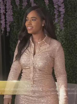 Grace on The Real Housewives of Potomac on Bravo was spotted wearing this pink sequin mini dress on The Real Housewives of Potomac on episode 'Cleaning Up the Mess' (7x10) in Dec 2022. 's Dress is the Brilliant Shine Sequin Shirt Dress by Fashion Nova.