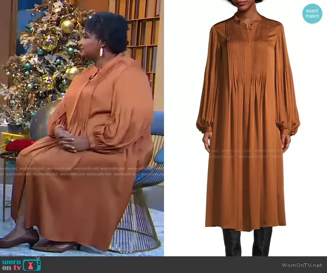 on Good Morning America on ABC was spotted wearing this brown pleated dress on Good Morning America on Dec 13 2022's episode. 's Dress is the Layla Pleated Satin Dress by Lafayette 148 New York . 's Earrings is the Elle Filigree Drop Earrings by Kendra Scott.