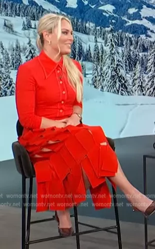 on Access Hollywood on NBC was spotted wearing this red button down shirt and skirt on Access Daily on Dec 13 2022's episode. 's Top is the Fitted Shirt with Back Ties by A.W.A.K.E Mode . 's Skirt is the Multi Rectangle Double-Layered Skirt by A.W.A.K.E Mode.
