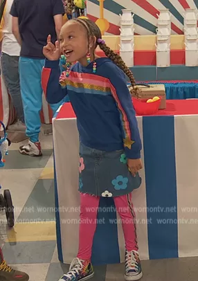 Alice Baxter (played by Mykal-Michelle Harris) on Ravens Home on Disney was spotted wearing this floral denim skirt on Ravens Home on episode 'Raven and the Fashion Factory' (5x22) in Nov 2022. Alice's Skirt is the Floral Print Raw Cut Denim Skirt by Shein.