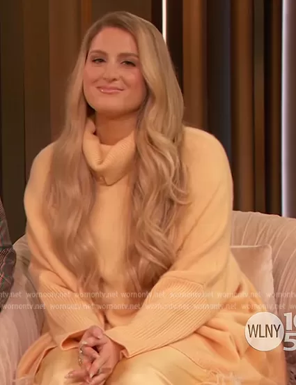 on The Drew Barrymore Show on CBS was spotted wearing this orange turtleneck sweater on The Drew Barrymore Show on Dec 14 2022's episode. 's Sweater is the Oversize Organic Cashmere Turtleneck Cape Sweater by LaPointe . 's Pants is the Ostrich Feather Trim Silk Twill Trousers by LaPointe.