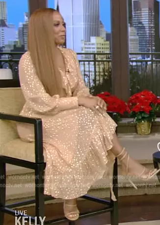on Live with Kelly and Mark on Disney ABC Home Entertainment was spotted wearing this yellow metallic dot wrap dress on Live with Kelly and Ryan on Dec 14 2022's episode. 's Dress is the Metallic Dot Wrap Midi-Dress by Zimmermann.