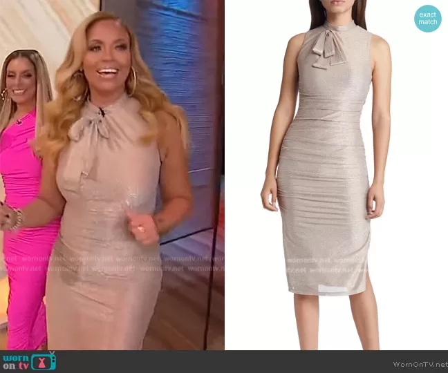 on Sherri on FOX was spotted wearing this metallic tie neck dress on Sherri on Dec 15 2022's episode. 's Dress is the Shaw Metallic Ruched Body-Con Cocktail Dress by Black Halo.