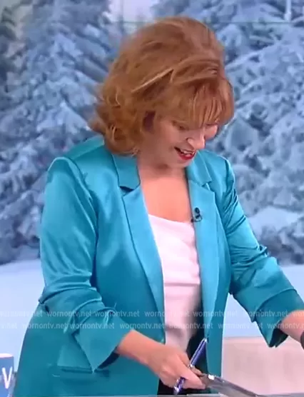 Joy Behar on The View on ABC was spotted wearing this blue satin blazer on The View on Dec 15 2022's episode. Joy's Blazer is the Kylie Scrunched-Sleeve Satin Blazer by Cinq a Sept.