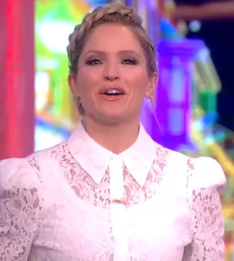 Sara Haines on The View on ABC was spotted wearing this white lace blouse on The View on Dec 15 2022's episode. Sara's Top is the Jenica Lace Blouse by L'Agence.