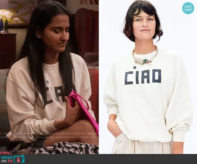 Bela Malhotra (played by Amrit Kaur) on The Sex Lives of College Girls on HBO was spotted wearing this CIAO sweatshirt on The Sex Lives of College Girls on episode 'Sex & Basketball' (2x09) in Dec 2022. Bela's Sweatshirt is the Ciao Oversized Sweatshirt by Clare V.