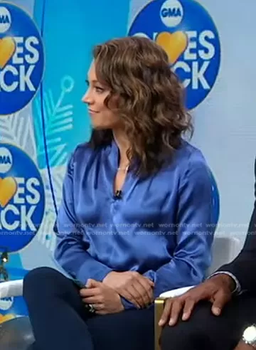 Ginger Zee on Good Morning America on ABC was spotted wearing this blue satin blouse on Good Morning America on Dec 15 2022's episode. Ginger's Top is the Contour Neck Shirt by Elie Tahari.