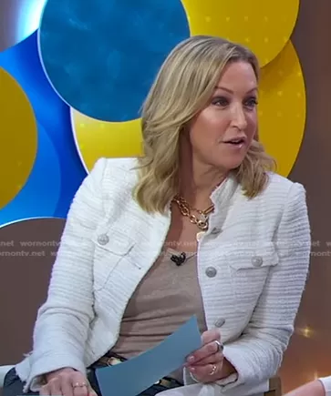 Lara Spencer on Good Morning America on ABC was spotted wearing this white tweed jacket on Good Morning America on Dec 15 2022's episode. Lara's Jacket is the Collarless Tweed Blazer by Zara.