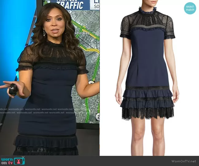 Adelle Caballero on Today on NBC was spotted wearing this navy lace mock neck dress on Today on Dec 15 2022's episode. Adelle's Dress is the Lace Mock-Neck Plisse Tulle Mini Cocktail Dress by Jonathan Simkhai.