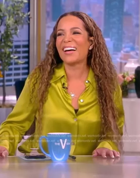 Sunny Hostin on The View on ABC was spotted wearing this lime satin blouse on The View on episode 'A Country Cousin Christmas' (5x25) in Nov 2022. Sunny's Top is the Silk Button-Up Blouse by Vince.